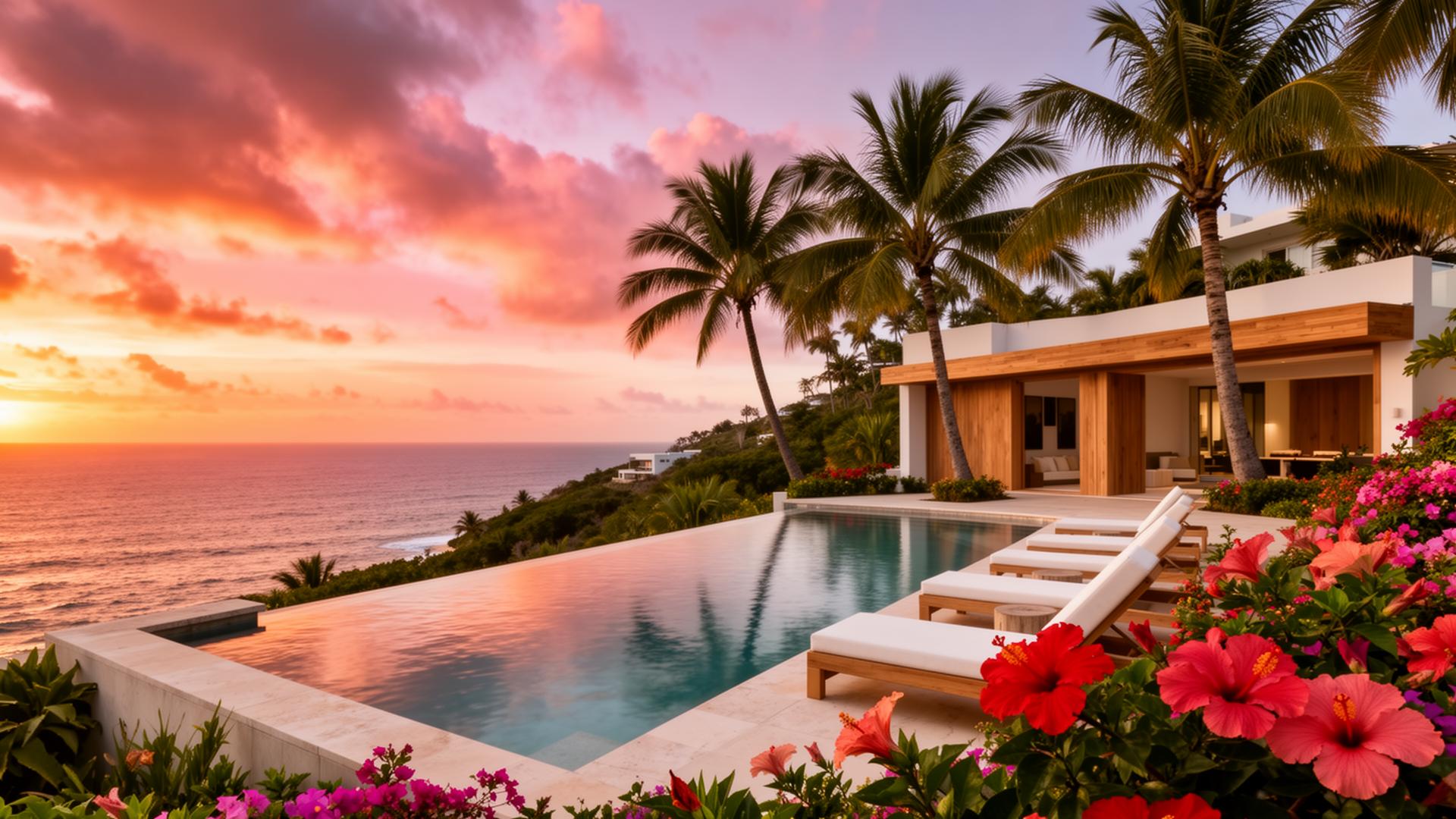 Villa hillside con piscina infinita y vistas al océano entre palmeras.